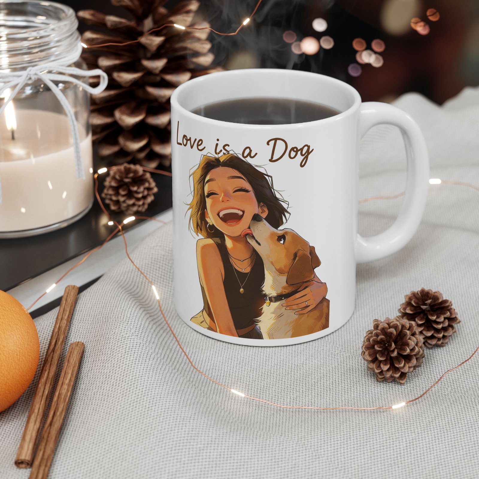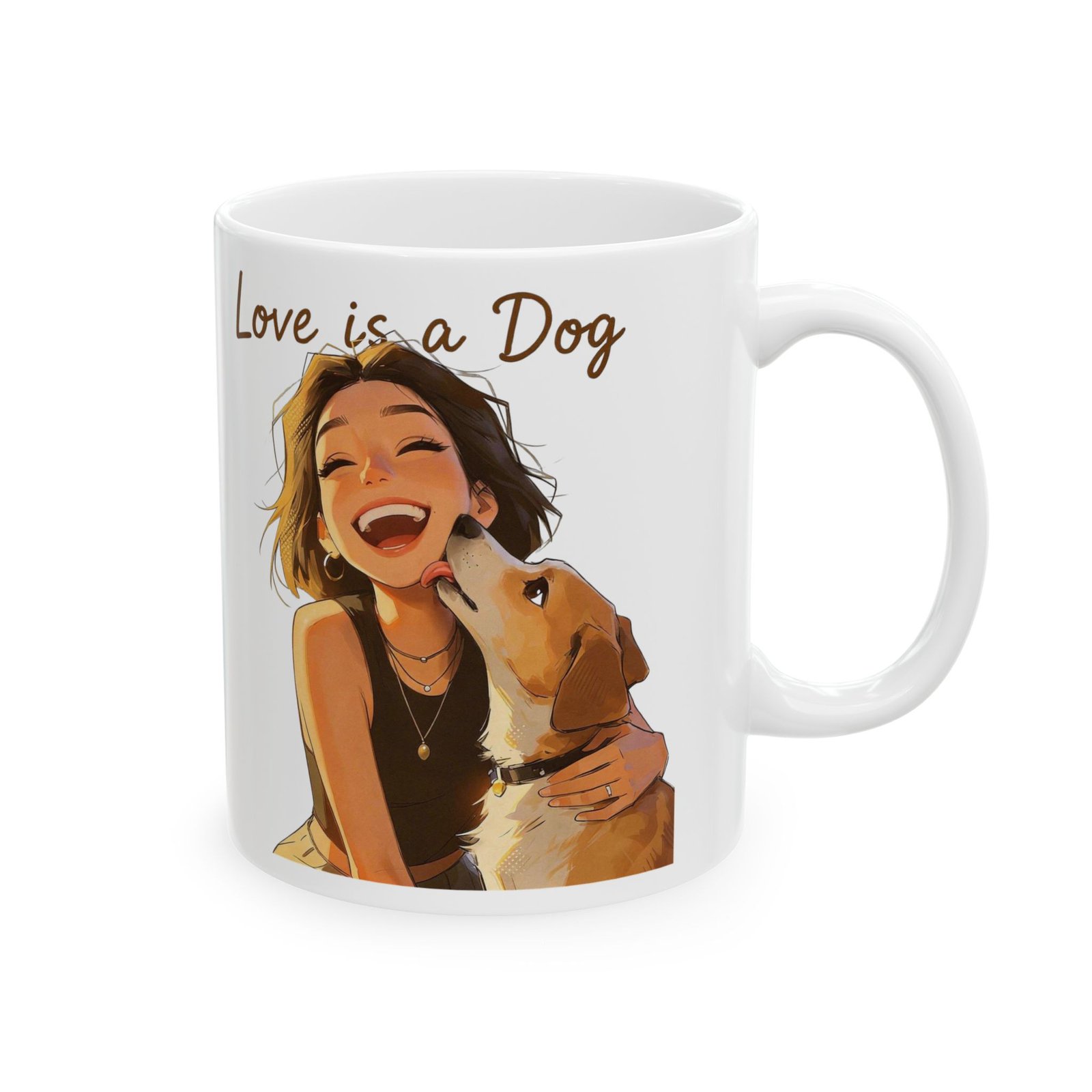 Slow mornings with a warm mug in hand and a wagging tail at your feet. This glossy ceramic mug features joyful, hand-drawn portraits of women cuddling their dogs with the phrase “Love is a Dog” scripted above—simple, sincere, and full of everyday warmth. Lightweight enough for daily use and vivid in print, the artwork wraps around the cup so each sip brings a small moment of comfort. It settles into kitchen counters, home office desks, and cozy nooks where pet-lovers pause between walks, work, and late-night chats with a furry friend.